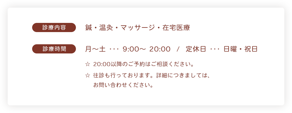 自然治癒力を高めて 根本からの改善 鍼灸治療は決して怖いものではありません、自然治癒力を高め根本から痛みを改善します。 最近疲れがなかなか取れない、寒くなると節々が痛む、病院に長く通っていても変化がないなどでお困りの方、お気軽にご相談ください。 当治療院では妊娠中のつわりや腰痛・逆子への不安を、鍼灸・マッサージ治療にて安産へのサポートも行っています!